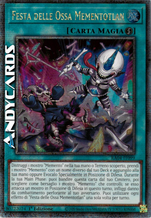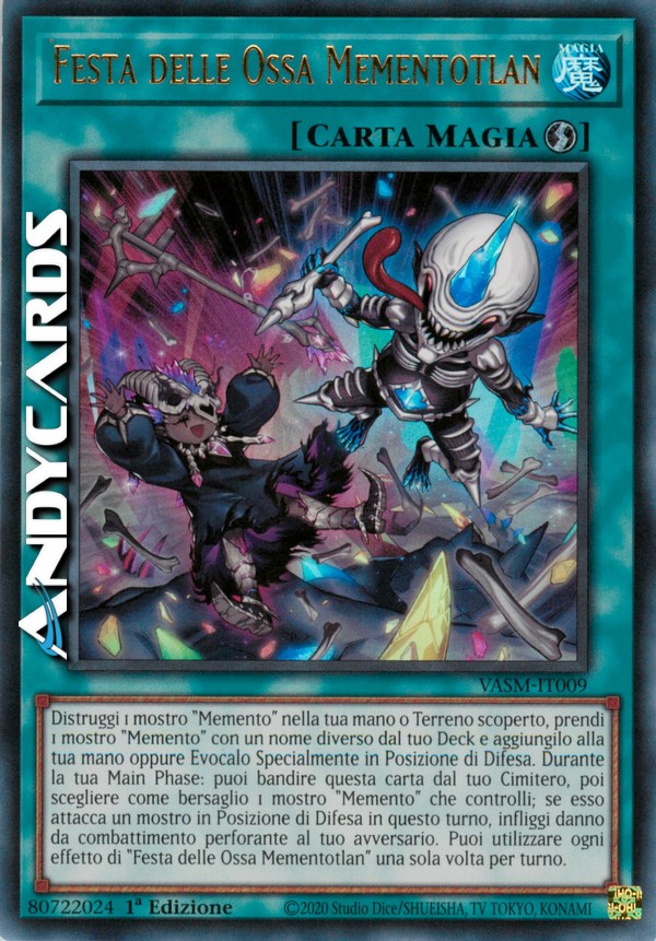Distruggi 1 mostro "Memento" nella tua mano o Terreno scoperto, prendi 1 mostro "Memento" con un nome diverso dal tuo Deck e aggiungilo alla tua mano oppure Evocalo Specialmente in Posizione di Difesa. Durante la tua Main Phase: puoi bandire questa carta dal tuo Cimitero, poi scegliere come bersaglio 1 mostro "Memento" che controlli; se esso attacca un mostro in Posizione di Difesa in questo turno, infliggi danno da combattimento perforante al tuo avversario. Puoi utilizzare ogni effetto di "Festa delle Ossa Mementotlan" una sola volta per turno.