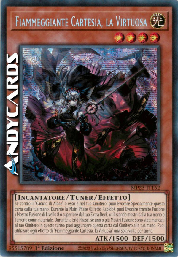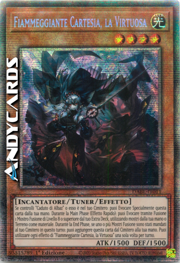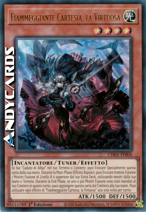 Se controlli "Caduto di Albaz" o esso è nel tuo Cimitero: puoi Evocare Specialmente questa carta dalla tua mano. Durante la Main Phase (Effetto Rapido): puoi Evocare tramite Fusione 1 Mostro Fusione di Livello 8 o superiore dal tuo Extra Deck, utilizzando mostri dalla tua mano o Terreno come materiale. Durante la End Phase, se uno o più Mostri Fusione sono stati mandati al tuo Cimitero in questo turno: puoi aggiungere questa carta dal Cimitero alla tua mano. Puoi utilizzare ogni effetto di "Fiammeggiante Cartesia, la Virtuosa" una sola volta per turno.