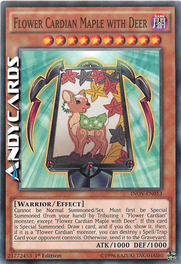 Cannot be Normal Summoned/Set. Must first be Special Summoned (from your hand) by Tributing 1 "Flower Cardian" monster, except "Flower Cardian Maple with Deer". If this card is Special Summoned: Draw 1 card, and if you do, show it, then, if it is a "Flower Cardian" monster, you can destroy 1 Spell/Trap Card your opponent controls. Otherwise, send it to the Graveyard.
