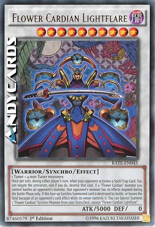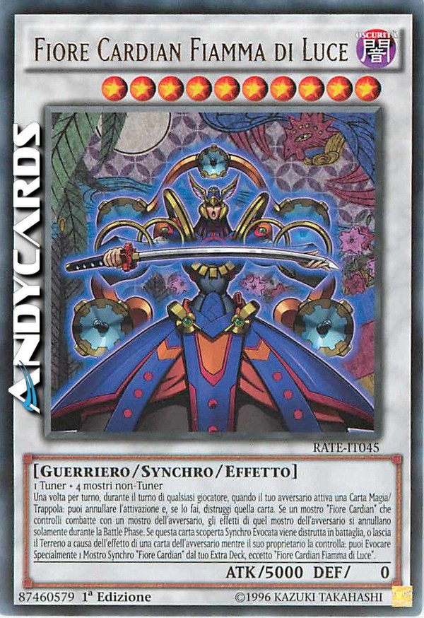 1 Tuner + 4 mostri non-Tuner - Una volta per turno, durante il turno di qualsiasi giocatore, quando il tuo avversario attiva una Carta Magia/Trappola: puoi annullare l'attivazione e, se lo fai, distruggi quella carta. Se un mostro "Fiore Cardian" che controlli combatte con un mostro dell'avversario, gli effetti di quel mostro dell'avversario si annullano solamente durante la Battle Phase. Se questa carta scoperta Synchro Evocata viene distrutta in battaglia, o lascia il Terreno a causa dell'effetto di una carta dell'avversario mentre il suo proprietario la controlla: puoi Evocare Specialmente 1 Mostro Synchro "Fiore Cardian" dal tuo Extra Deck, eccetto "Fiore Cardian Fiamma di Luce".