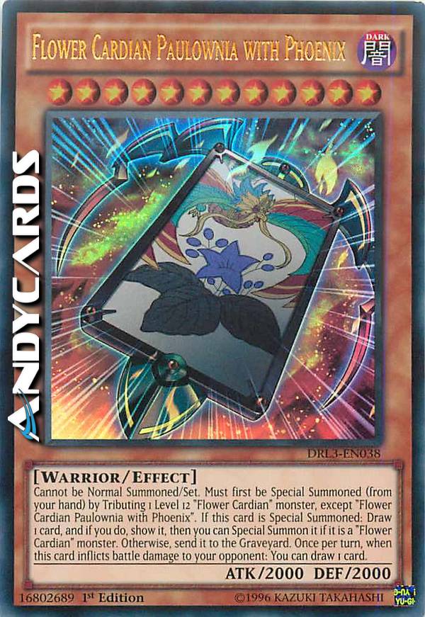 Cannot be Normal Summoned/Set. Must first be Special Summoned (from your hand) by Tributing 1 Level 12 "Flower Cardian" monster, except "Flower Cardian Paulownia with Phoenix". If this card is Special Summoned: Draw 1 card, and if you do, show it, then you can Special Summon it if it is a "Flower Cardian" monster. Otherwise, send it to the Graveyard. Once per turn, when this card inflicts battle damage to your opponent: You can draw 1 card.