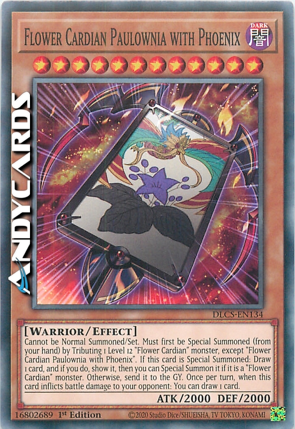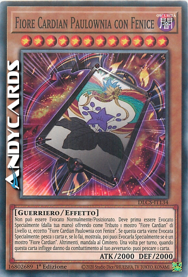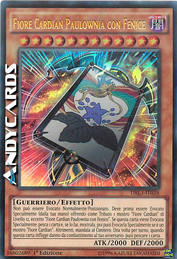 Non può essere Evocato Normalmente/Posizionato. Deve prima essere Evocato Specialmente (dalla tua mano) offrendo come Tributo 1 mostro "Fiore Cardian" di Livello 12, eccetto "Fiore Cardian Paulownia con Fenice". Se questa carta viene Evocata Specialmente: pesca 1 carta e, se lo fai, mostrala, poi puoi Evocarla Specialmente se è un mostro "Fiore Cardian". Altrimenti, mandala al Cimitero. Una volta per turno, quando questa carta infligge danno da combattimento al tuo avversario: puoi pescare 1 carta.