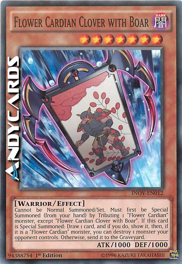 Cannot be Normal Summoned/Set. Must first be Special Summoned (from your hand) by Tributing 1 "Flower Cardian" monster, except "Flower Cardian Clover with Boar". If this card is Special Summoned: Draw 1 card, and if you do, show it, then, if it is a "Flower Cardian" monster, you can destroy 1 monster your opponent controls. Otherwise, send it to the Graveyard.