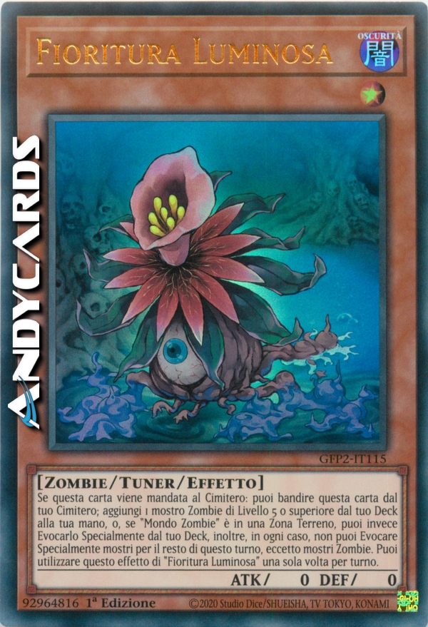 Se questa carta viene mandata al Cimitero: puoi bandire questa carta dal tuo Cimitero; aggiungi 1 mostro Zombie di Livello 5 o superiore dal tuo Deck alla tua mano, o, se "Mondo Zombie" è in una Zona Terreno, puoi invece Evocarlo Specialmente dal tuo Deck, inoltre, in ogni caso, non puoi Evocare Specialmente mostri per il resto di questo turno, eccetto mostri Zombie. Puoi utilizzare questo effetto di "Fioritura Luminosa" una sola volta per turno.