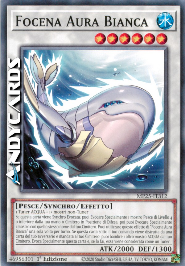 Se questa carta viene Synchro Evocata: puoi Evocare Specialmente 1 mostro Pesce di Livello 4 o inferiore dalla tua mano o Cimitero in Posizione di Difesa, poi puoi Evocare Specialmente 1 mostro con quello stesso nome dal tuo Cimitero. Puoi utilizzare questo effetto di "Focena Aura Bianca" una sola volta per turno. Se questa carta sotto il tuo comando viene distrutta da una carta del tuo avversario e mandata al tuo Cimitero: puoi bandire 1 altro mostro ACQUA dal tuo Cimitero; Evoca Specialmente questa carta e, se lo fai, essa viene considerata come un Tuner.
