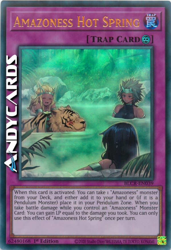 Quando questa carta viene attivata: puoi prendere 1 mostro "Amazoness" dal tuo Deck, e aggiungerlo alla tua mano oppure (se è un Mostro Pendulum) metterlo nella tua Zona Pendulum. Quando subisci danno da combattimento mentre controlli una Carta Mostro "Amazoness": puoi guadagnare LP pari al danno che hai subito. Puoi utilizzare questo effetto di "Fonte Termale Amazoness" una sola volta per turno.