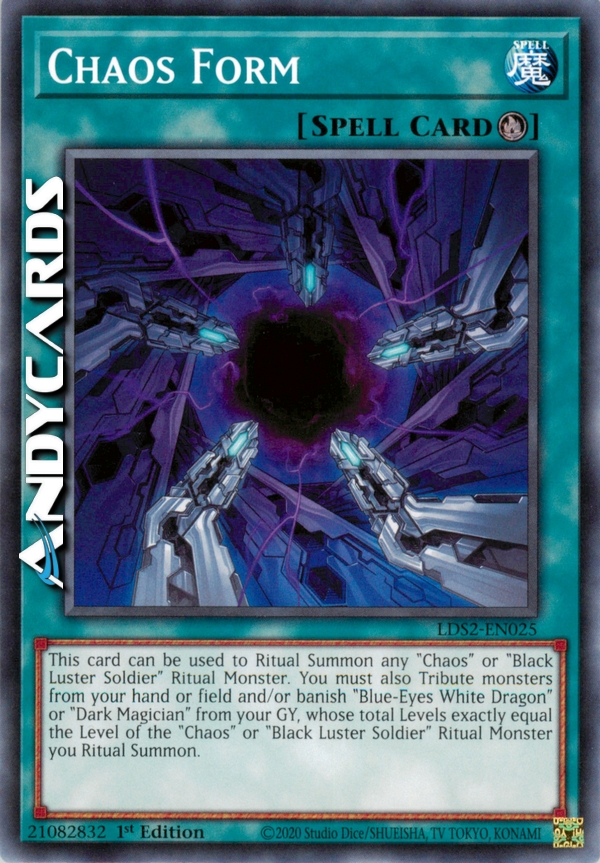 This card can be used to Ritual Summon any "Chaos" or "Black Luster Soldier" Ritual Monster. You must also Tribute monsters from your hand or field and/or banish "Blue-Eyes White Dragon" or "Dark Magician" from your GY, whose total Levels exactly equal the Level of the "Chaos" or "Black Luster Soldier" Ritual Monster you Ritual Summon.
