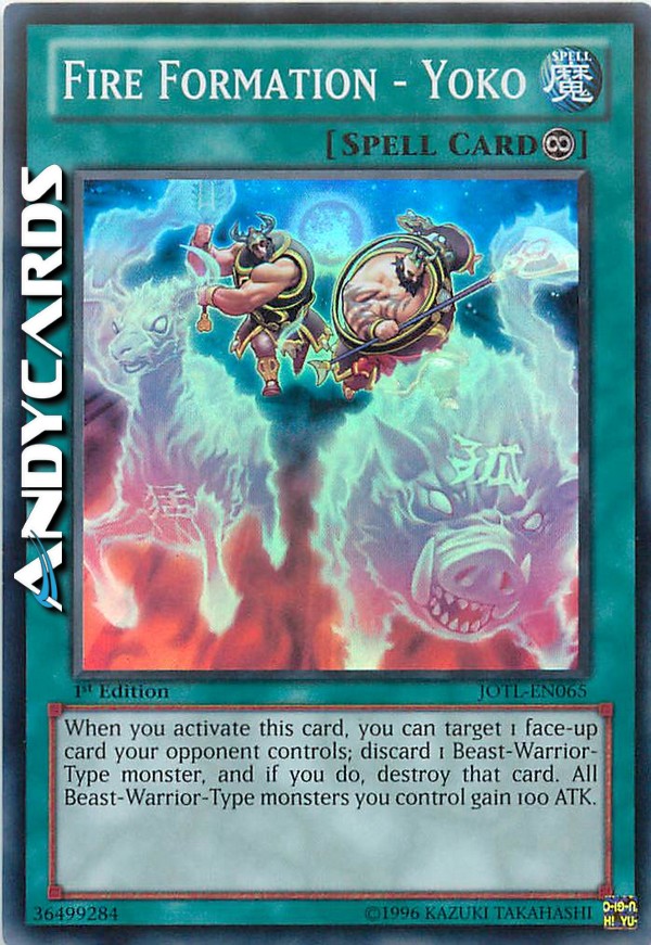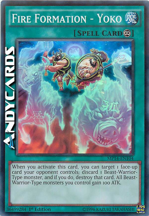 When this card is activated: You can target 1 face-up card your opponent controls; discard 1 Beast-Warrior-Type monster, then destroy that target. All Beast-Warrior-Type monsters you control gain 100 ATK.