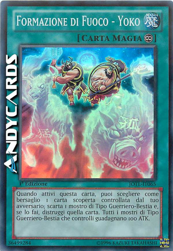 Quando attivi questa carta, puoi scegliere come bersaglio 1 carta scoperta controllata dal tuo avversario; scarta 1 mostro di Tipo Guerriero-Bestia e, se lo fai, distruggi quella carta. Tutti i mostri di Tipo Guerriero-Bestia che controlli guadagnano 100 ATK.