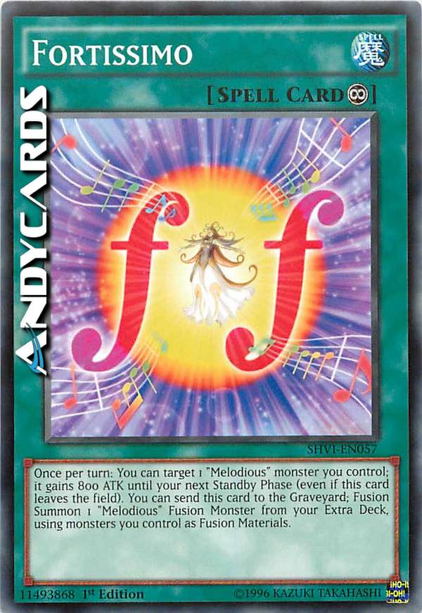 Una volta per turno: puoi scegliere come bersaglio 1 mostro "Melodiosa" che controlli; esso guadagna 800 ATK fino alla tua prossima Standby Phase (anche se questa carta lascia il Terreno). Puoi mandare questa carta al Cimitero; Evoca tramite Fusione 1 Mostro Fusione "Melodiosa" dal tuo Extra Deck, utilizzando mostri che controlli come Materiali da Fusione.