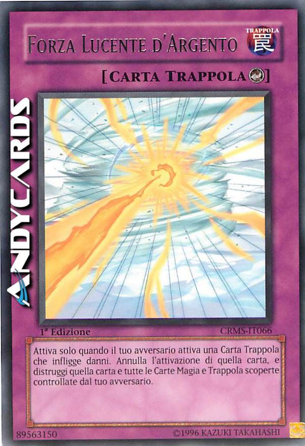 Attiva solo quando il tuo avversario attiva una carta trappola che infligge danni.Annulla l'attivazione di quella carta,e distruggi quella carta e tutte le carte magia e trappola scoperte controllate dal tuo avversario.