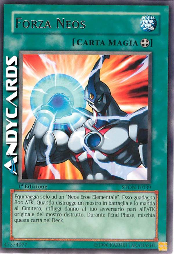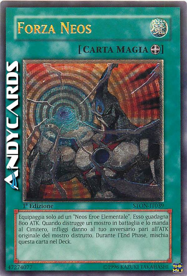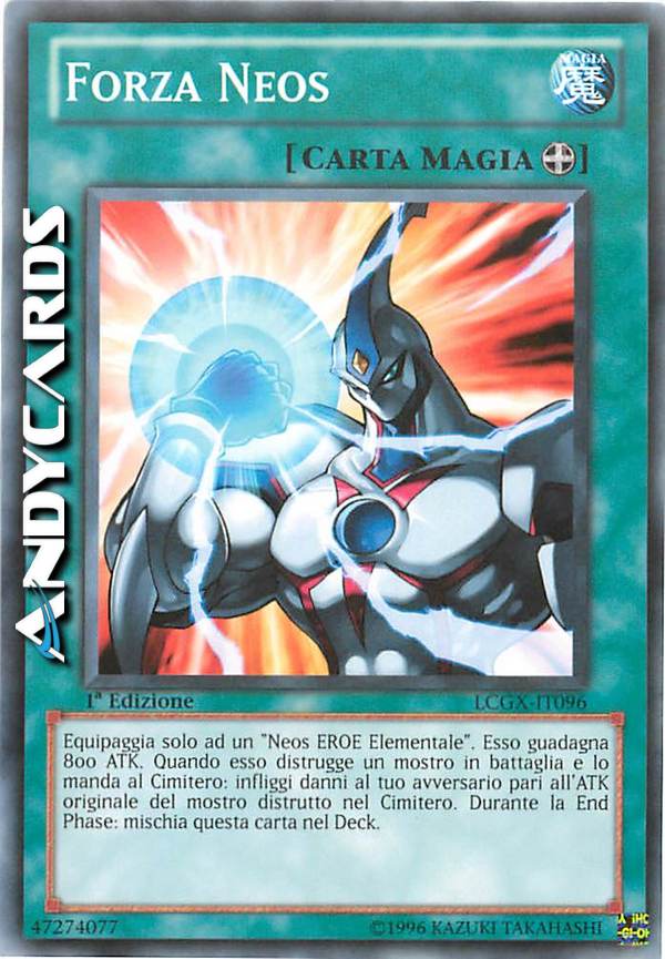 Equipaggia solo ad un "Neos Eroe Elementale". Esso guadagna 800 ATK. Quando distruggi un mostro in battaglia e lo manda al Cimitero, infliggi danno al tuo avversario pari all'ATK originale del mostro distrutto. Durante l'End Phase, mischia questa carta nel Deck.
