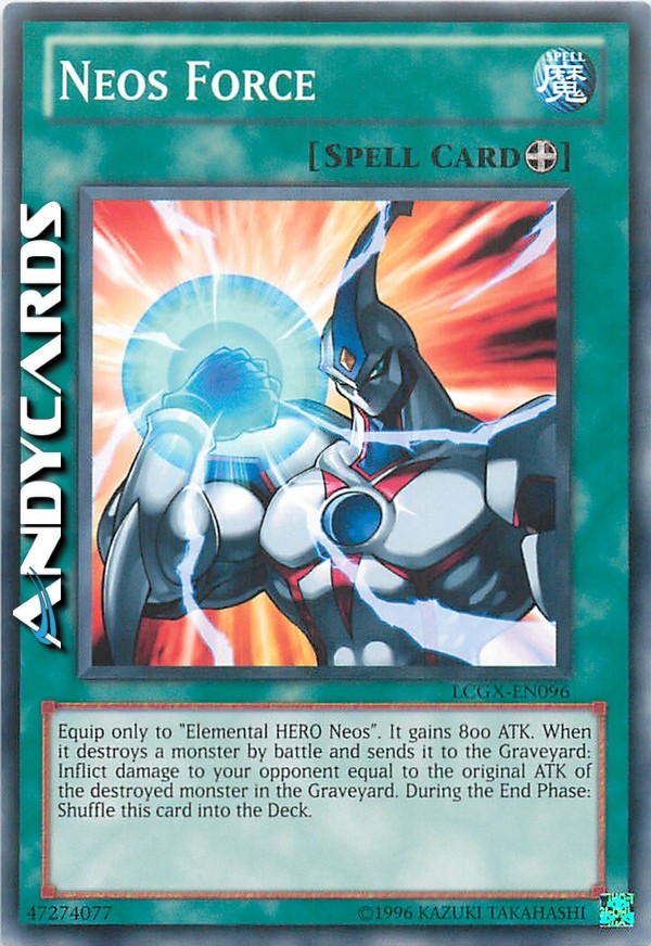 Equip only to "Elemental HERO Neos". It gains 800 ATK. When it destroys a monster by battle and sends it to the Graveyard: Inflict damage to your opponent equal to the original ATK of the destroyed monster. During the End Phase: Shuffle this card into the Deck.