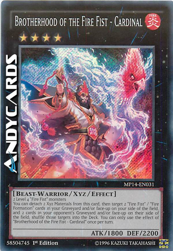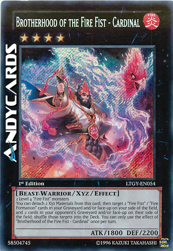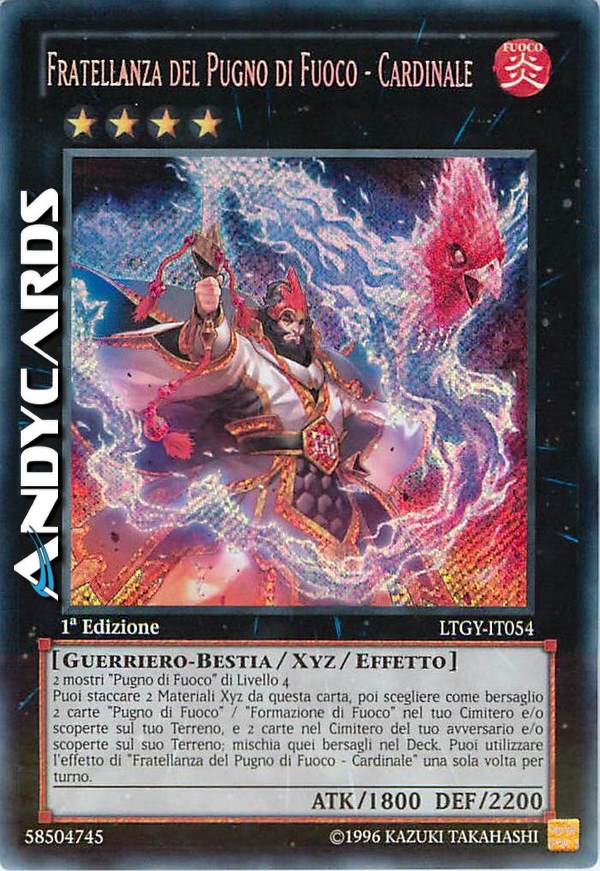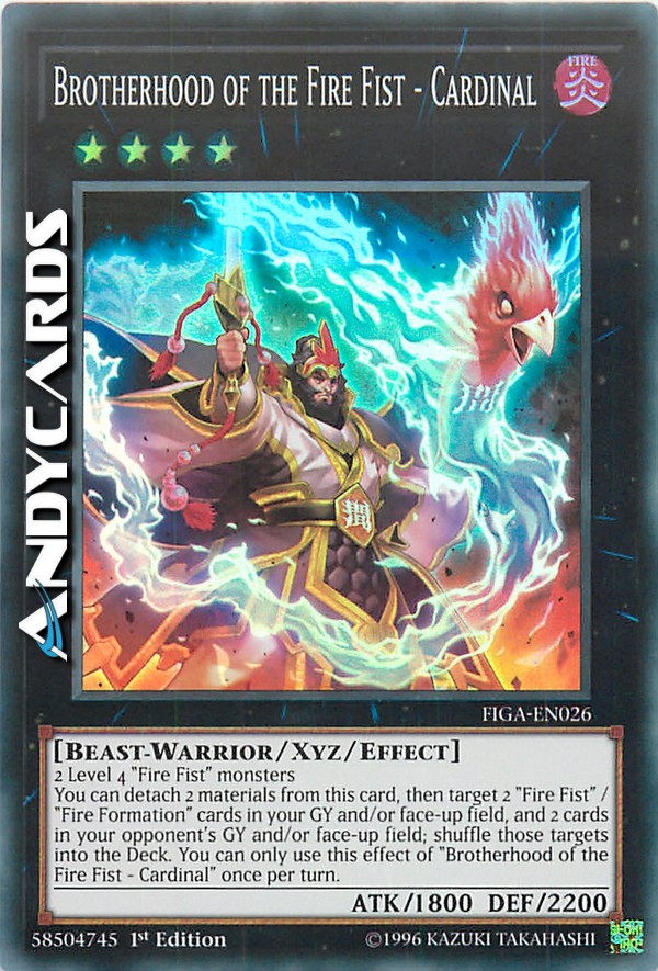 Puoi staccare 2 Materiali Xyz da questa carta, poi scegliere come bersaglio 2 carte "Pugno di Fuoco"/"Formazione di Fuoco" nel tuo Cimitero e/o scoperte sul tuo Terreno, e 2 carte nel Cimitero del tuo avversario e/o scoperte sul suo Terreno; mischia quei bersagli nel Deck. Puoi utilizzare l'effetto di "Fratellanza del Pugno di Fuoco - Cardinale" una sola volta per turno.