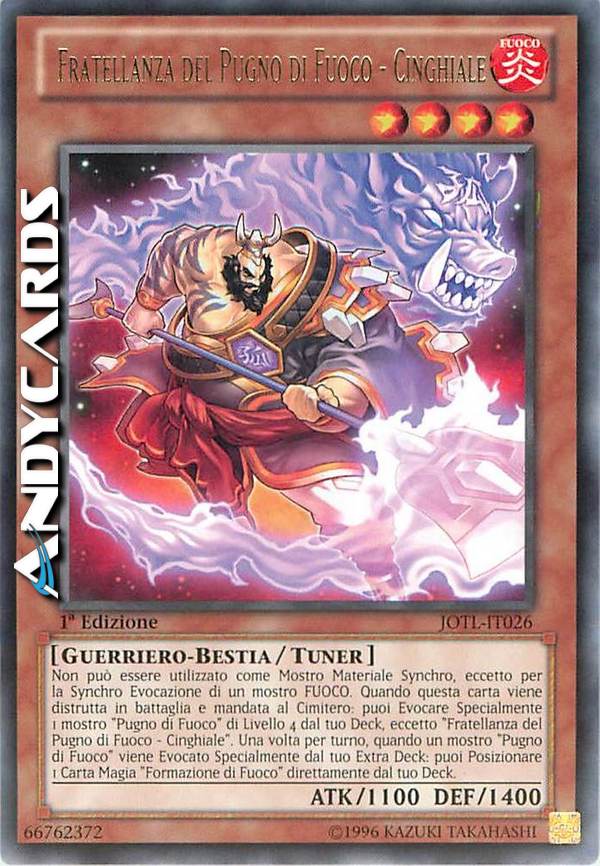 Non può essere utilizzato come Mostro Materiale Synchro, eccetto per la Synchro Evocazione di un mostro FUOCO. Quando questa carta viene distrutta in battaglia e mandata al Cimitero: puoi Evocare Specialmente 1 mostro "Pugno di Fuoco" di Livello 4 dal tuo Deck, eccetto "Fratellanza del Pugno di Fuoco - Cinghiale". Una volta per turno, quando un mostro "Pugno di Fuoco" viene Evocato Specialmente dal tuo Extra Deck; puoi Posizionare 1 Carta Magia "Formazione di Fuoco" direttamente dal tuo Deck.