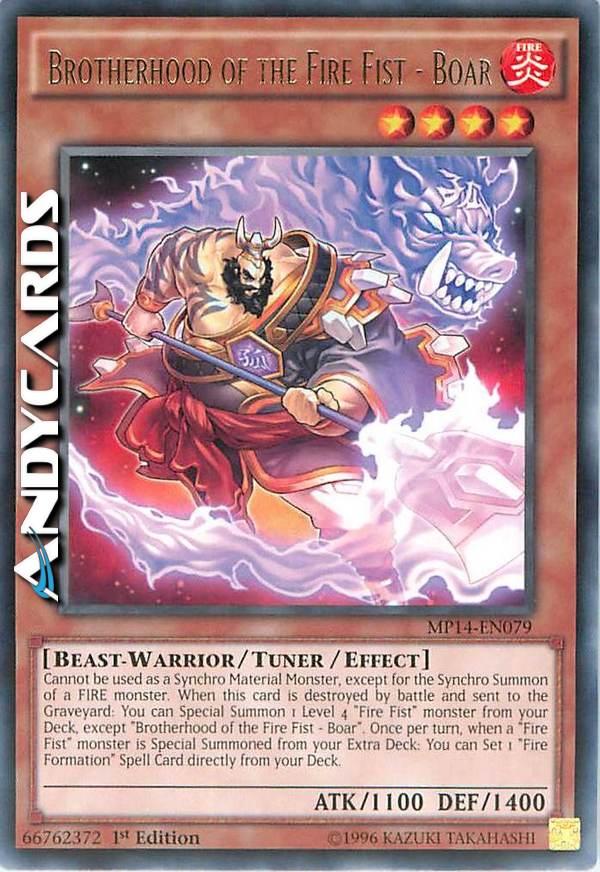 Cannot be used as a Synchro Material Monster, except for the Synchro Summon of a FIRE monster. When this card is destroyed by battle and sent to the Graveyard: You can Special Summon 1 Level 4 "Fire Fist" monster from your Deck, except "Brotherhood of the Fire Fist - Boar". Once per turn, when a "Fire Fist" monster is Special Summoned from your Extra Deck: You can Set 1 "Fire Formation" Spell Card directly from your Deck.