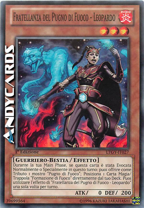 Durante la tua Main Phase, se questa carta è stata Evocata Normalmente o Specialmente in questo turno: puoi offrire come Tributo 1 mostro "Pugno di Fuoco"; Posiziona 1 Carta Magia/Trappola "Formazione di Fuoco" direttamente dal tuo Deck. Puoi utilizzare l'effetto di "Fratellanza del Pugno di Fuoco - Leopardo" una sola volta per turno.