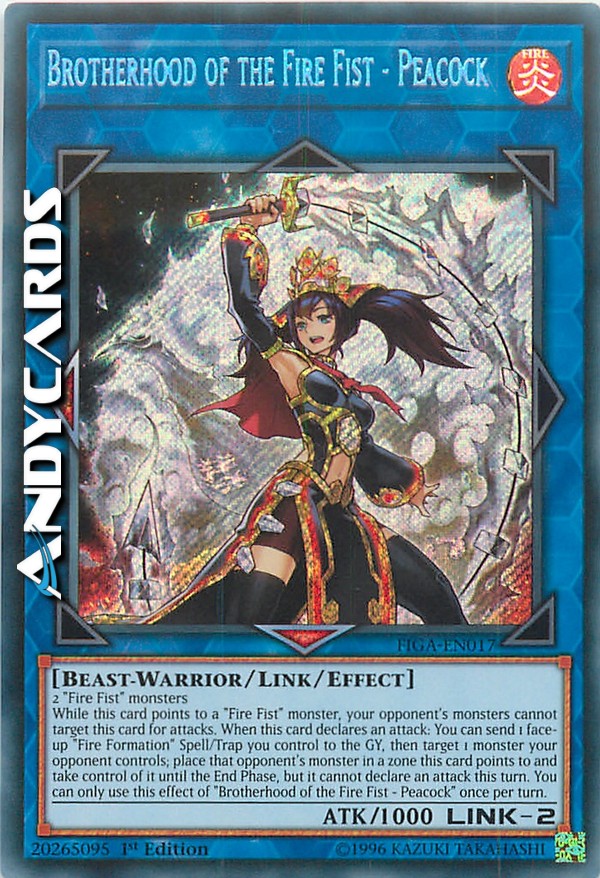 Mentre questa carta punta un mostro "Pugno di Fuoco", i mostri del tuo avversario non possono scegliere questa carta come bersaglio per gli attacchi. Quando questa carta dichiara un attacco: puoi mandare 1 Magia/Trappola "Formazione di Fuoco" scoperta che controlli al Cimitero, poi scegliere come bersaglio 1 mostro controllato dal tuo avversario; metti quel mostro dell'avversario in una zona puntata da questa carta e prendine il controllo fino alla End Phase, ma esso non può dichiarare un attacco in questo turno. Puoi utilizzare questo effetto di "Fratellanza del Pugno di Fuoco - Pavone" una sola volta per turno.