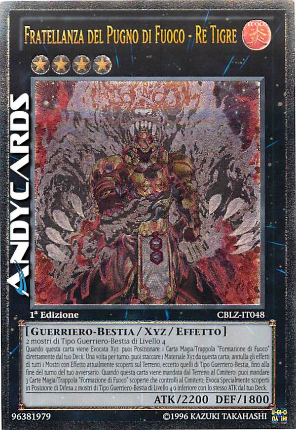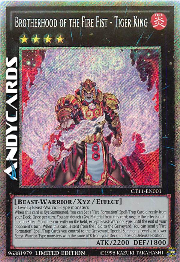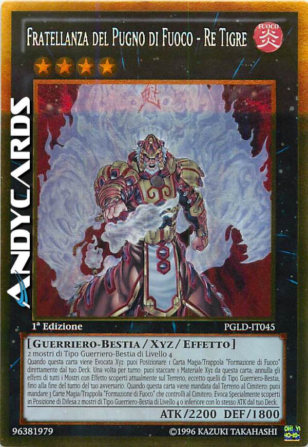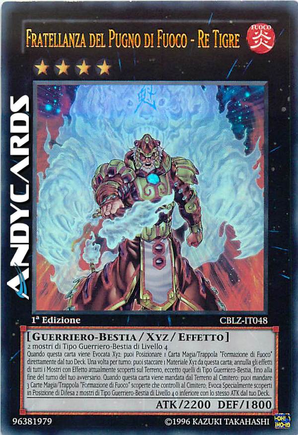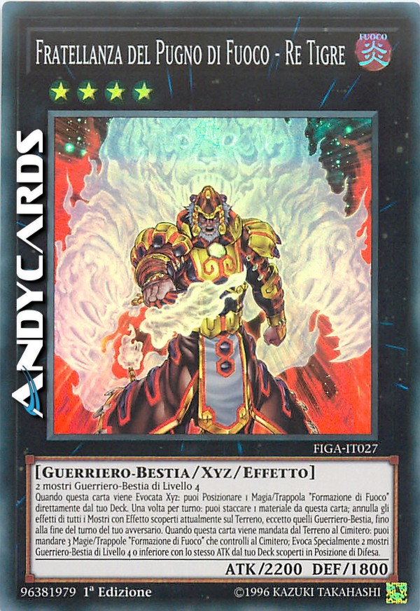 Quando questa carta viene Evocata Xyz: puoi Posizionare 1 Carta Magia/Trappola "Formazione di Fuoco" direttamente dal tuo Deck. Una volta per turno: puoi staccare 1 Materiale Xyz da questa carta; annulla gli effetti di tutti i Mostri con Effetto scoperti attualmente sul Terreno, eccetto quelli di Tipo Guerriero-Bestia, fino alla fine del turno del tuo avversario. Quando questa carta viene mandata dal Terreno al Cimitero: puoi mandare 3 Carte Magia/Trappola "Formazione di Fuoco" che controlli al Cimitero; Evoca Specialmente scoperti in Posizione di Difesa 2 mostri di Tipo Guerriero-Bestia di Livello 4 o inferiore con lo stesso ATK dal tuo Deck.