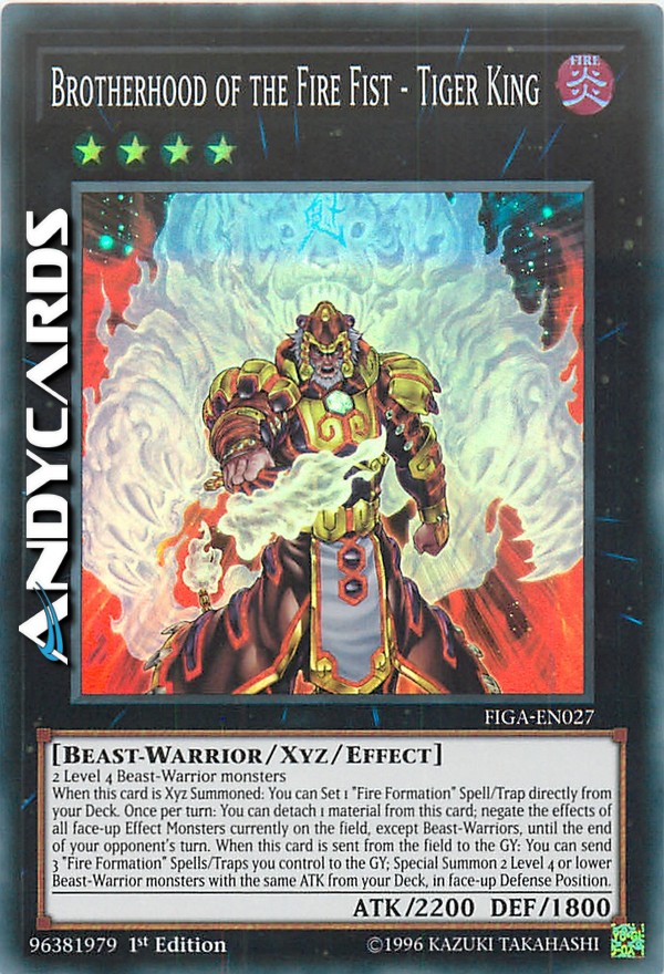 When this card is Xyz Summoned: You can Set 1 "Fire Formation" Spell/Trap Card directly from your Deck. Once per turn: You can detach 1 Xyz Material from this card; negate the effects of all face-up Effect Monster currently on the field, except Beast-Warrior-Type, until the end of your opponent's turn. When this card is sent from the field to the Graveyard: You can send 3 face-up "Fire Formation" Spell/Trap Cards you control to the Graveyard; Special Summon 2 Level 4 or lower Beast-Warrior-Type monsters with the same ATK from your Deck, in face-up Defense Position.