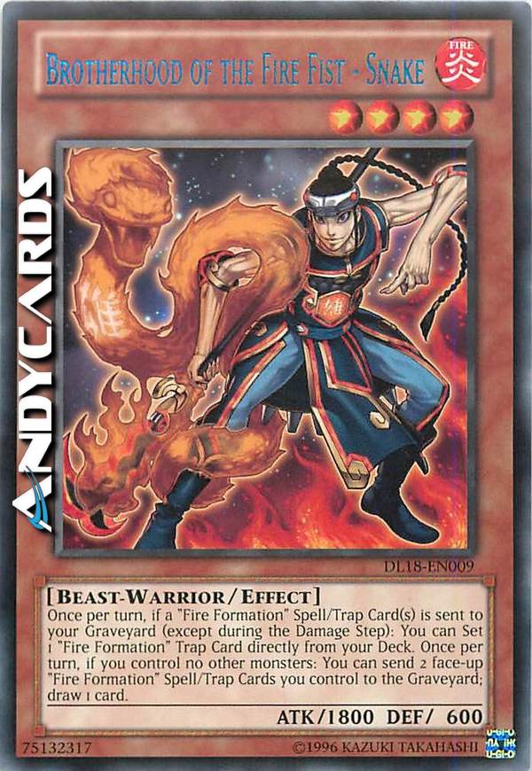 Once per turn, if a "Fire Formation" Spell/Trap Card(s) is sent to your Graveyard (except during the Damage Step): You can Set 1 "Fire Formation" Trap Card directly from your Deck. Once per turn, if you control no other monsters: You can send 2 face-up "Fire Formation" Spell/Trap Cards you control to the Graveyard; draw 1 card.