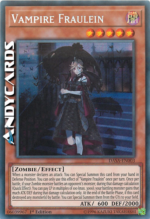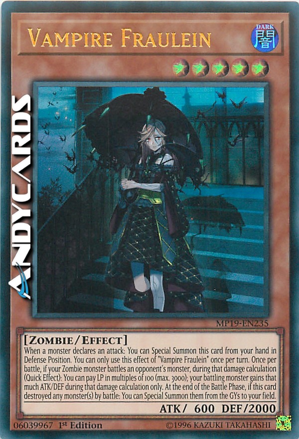 Quando un mostro dichiara un attacco: puoi Evocare Specialmente questa carta dalla tua mano in Posizione di Difesa. Puoi utilizzare questo effetto di "Fraulein Vampira" una sola volta per turno. Una volta per battaglia, se un tuo mostro Zombie combatte con un mostro dell'avversario, durante quel calcolo dei danni (Effetto Rapido): puoi pagare LP in multipli di 100 (massimo 3000); il tuo mostro che sta combattendo guadagna quell'ammontare di ATK/DEF solamente durante quel calcolo dei danni. Alla fine della Battle Phase, se questa carta ha distrutto uno o più mostri in battaglia: puoi Evocarli Specialmente dai Cimiteri sul tuo Terreno.