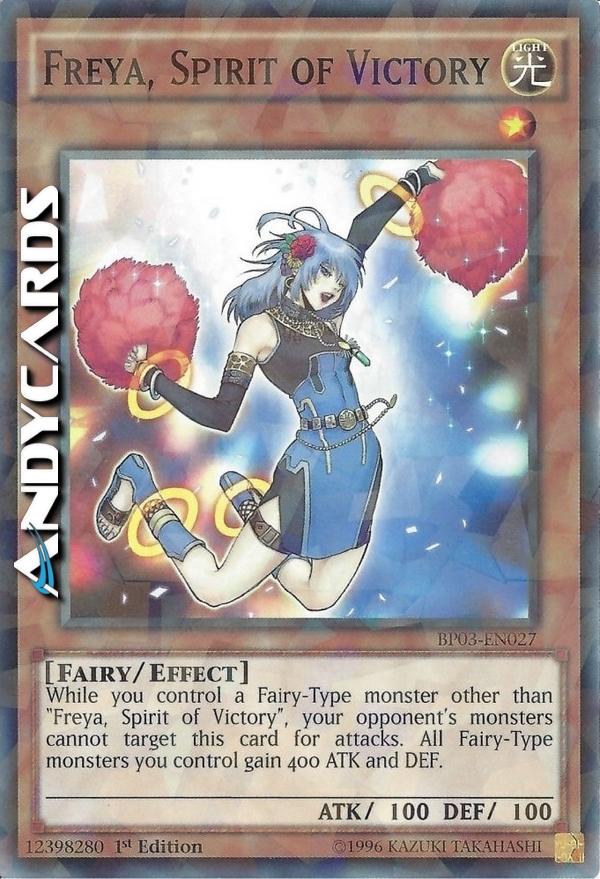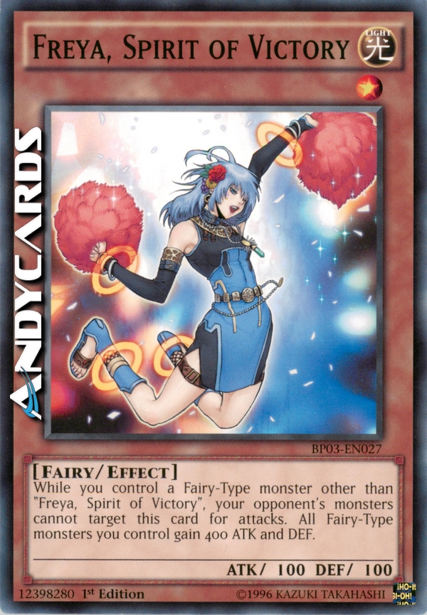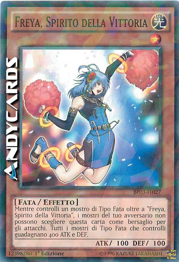 Fino a quando controlli uno o più mostri scoperti di Tipo Fata oltre a "Freya, Spirito della Vittoria", questa carta non può essere scelta come bersaglio di un attacco. Tutti i mostri di Tipo Fata che controlli guadagnano 400 ATK e DEF.