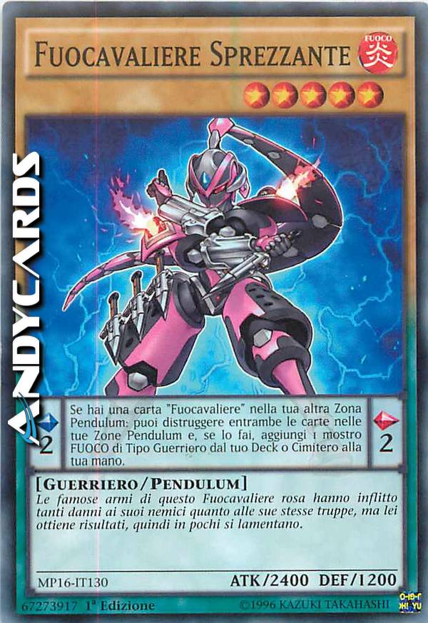 Le famose armi di questo Fuocavaliere rosa hanno inflitto tanti danni ai suoi nemici quanto alle sue stesse truppe, ma lei ottiene risultati, quindi in pochi si lamentano. Effetto Pendulum: Se hai una carta "Fuocavaliere" nella tua altra Zona Pendulum: puoi distruggere entrambe le carte nelle tue Zone Pendulum e, se lo fai, aggiungi 1 mostro FUOCO di Tipo Guerriero dal tuo Deck o Cimitero alla tua mano.
