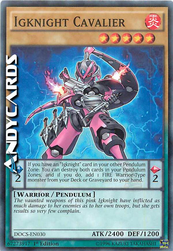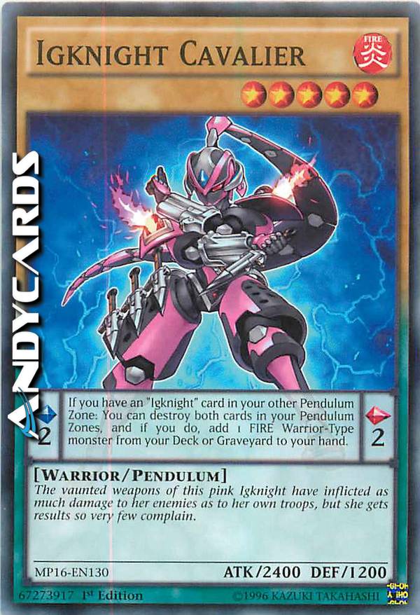 The vaunted weapons of this pink Igknight have inflicted as much damage to her enemies as to her own troops, but she gets results so very few complain. - Pendulum Scale: 2 - Pendulum Effect: If you have an "Igknight" card in your other Pendulum Zone: You can destroy both cards in your Pendulum Zones, and if you do, add 1 FIRE Warrior-Type monster from your Deck or Graveyard to your hand.