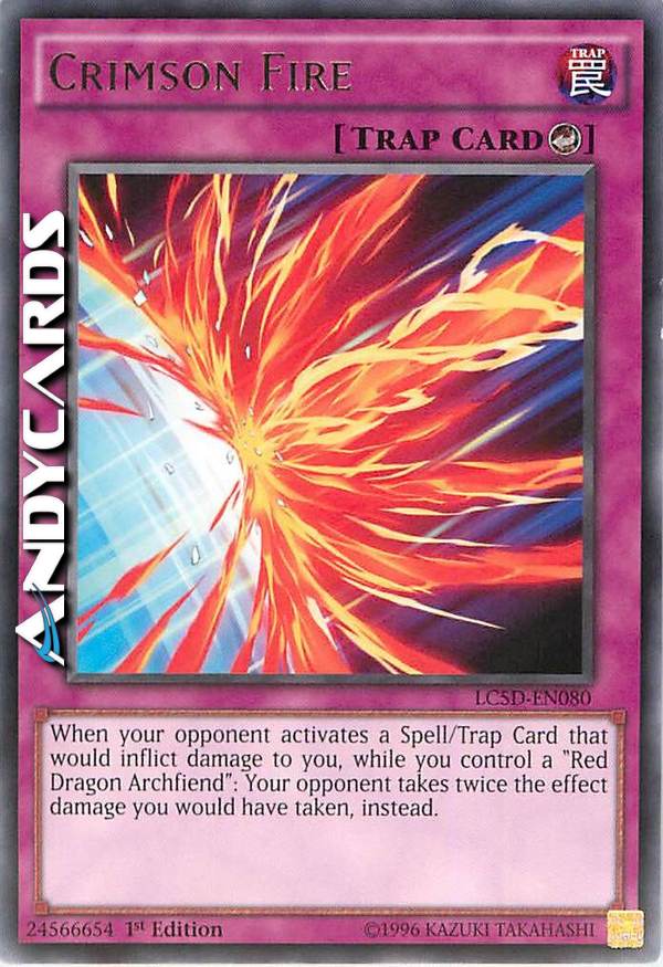 Activate only when your opponent activates a Spell or Trap Card that inflicts damage while you control a face-up "Red Dragon Archfiend". You take no damage, and your opponent takes twice the effect damage you would have taken, instead.