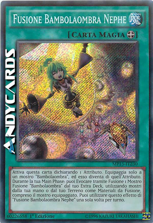 Attiva questa carta dichiarando 1 attributo. Equipaggia solo a un mostro "Bambolaombra", ed esso diventa di quell'attributo. Durante la tua Main Phase: puoi Evocare tramite Fusione 1 Mostro Fusione "Bambolaombra" dal tuo Extra Deck, utilizzando mostri dalla tua mano odal tuo Terreno come Materiali da Fusione, compreso il mostro equipaggiato. Puoi utilizzare questo effetto di "Fusione Bambolaombra Nephe" una sola volta per turno.