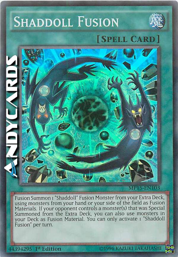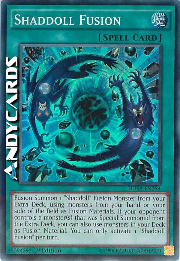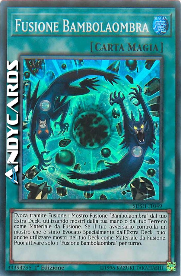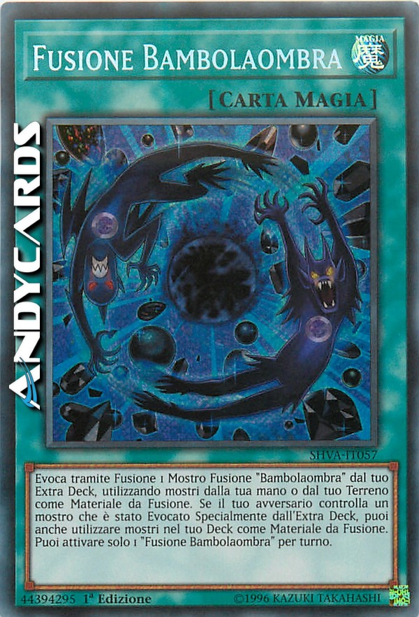 Evoca tramite Fusione 1 Mostro Fusione "Bambolaombra" dal tuo Extra Deck, utilizzando mostri dalla tua mano o dal tuo Terreno come Materiale da Fusione. Se il tuo avversario controlla un mostro che è stato Evocato Specialmente dall'Extra Deck, puoi anche utilizzare mostri nel tuo Deck come Materiale da Fusione. Puoi attivare solo 1 "Fusione Bambolaombra" per turno.