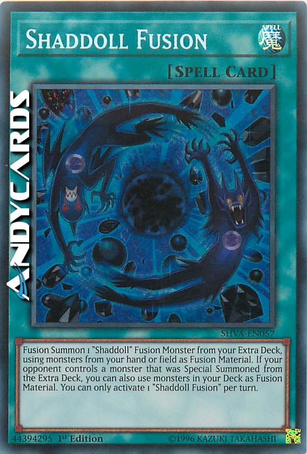 Fusion Summon 1 "Shaddoll" Fusion Monster from your Extra Deck, using monsters from your hand or field as Fusion Material. If your opponent controls a monster that was Special Summoned from the Extra Deck, you can also use monsters in your Deck as Fusion Material. You can only activate 1 "Shaddoll Fusion" per turn.