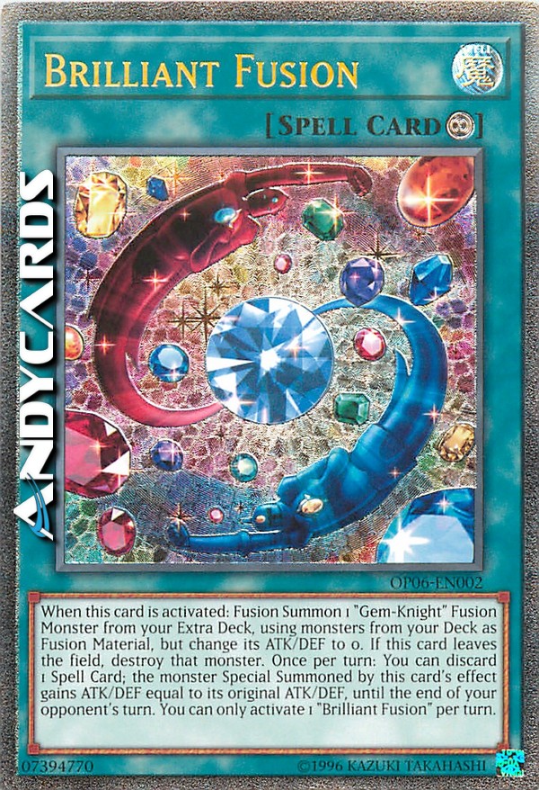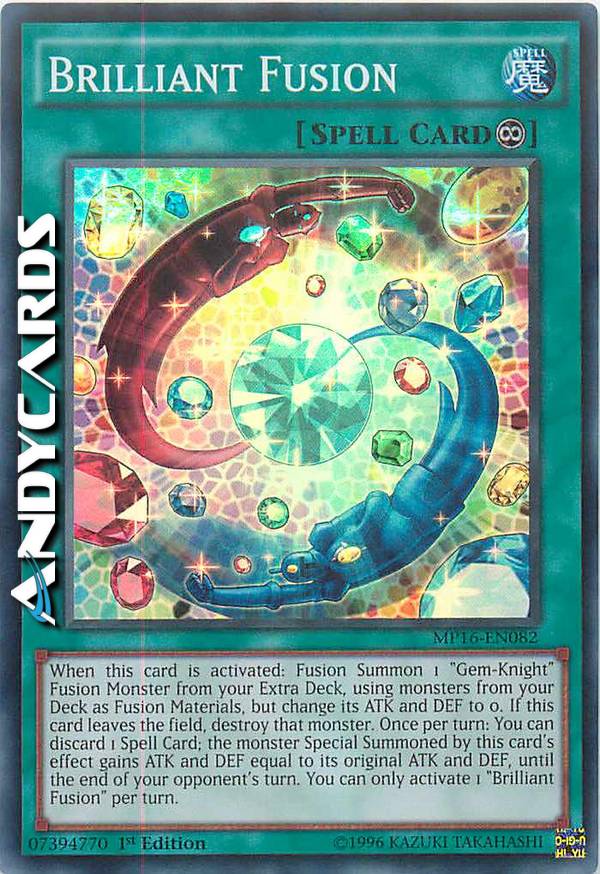 When this card is activated: Fusion Summon 1 "Gem-Knight" Fusion Monster from your Extra Deck, using monsters from your Deck as Fusion Material, but change its ATK/DEF to 0. If this card leaves the field, destroy that monster. Once per turn: You can discard 1 Spell; the monster Special Summoned by this card's effect gains ATK/DEF equal to its original ATK/DEF, until the end of your opponent's turn. You can only activate 1 "Brilliant Fusion" per turn.