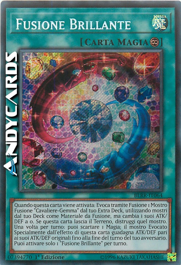 Quando questa carta viene attivata: Evoca tramite Fusione 1 Mostro Fusione "Cavaliere-Gemma" dal tuo Extra Deck, utilizzando mostri dal tuo Deck come Materiali da Fusione, ma cambia i suoi ATK e DEF a 0. Se questa carta lascia il Terreno, distruggi quel mostro. Una volta per turno: puoi scartare 1 Carta Magia; il mostro Evocato Specialmente dall'effetto di questa carta guadagna ATK e DEF pari ai suoi ATK e DEF originali fino alla fine del turno del tuo avversario. Puoi attivare solo 1 "Fusione Brillante" per turno.