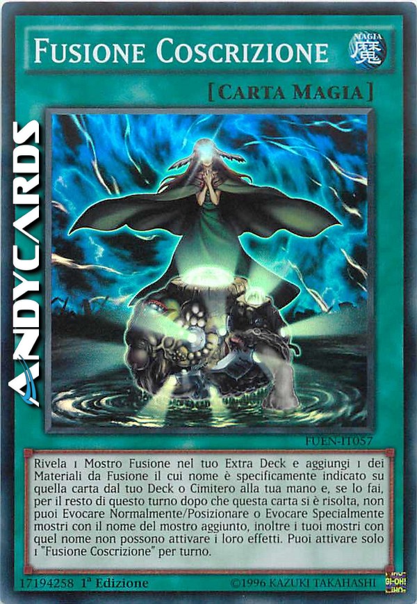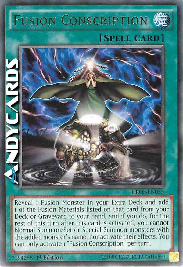 Rivela 1 Mostro Fusione nel tuo Extra Deck e aggiungi 1 dei Materiali da Fusione indicati su quella carta dal tuo Deck o Cimitero alla tua mano e, se lo fai, per il resto di questo turno dopo che questa carta è stata attivata, non puoi Evocare Normalmente/Posizionare o Evocare Specialmente mostri con il nome del mostro aggiunto alla mano, né attivare i loro effetti. Puoi attivare solo 1 "Fusione Coscrizione" per turno.