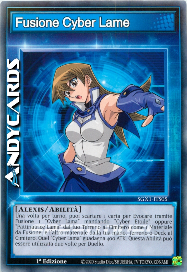 Una volta per turno, puoi scartare 1 carta per Evocare tramite Fusione 1 "Cyber Lama" mandando "Cyber Etoile" oppure "Pattinatrice Lama" dal tuo Terreno al Cimitero come 1 Materiale da Fusione, e l'altro materiale dalla tua mano, Terreno o Deck al Cimitero. Quel "Cyber Lama" guadagna 400 ATK. Questa abilità può essere utilizzata due volte per Duello.