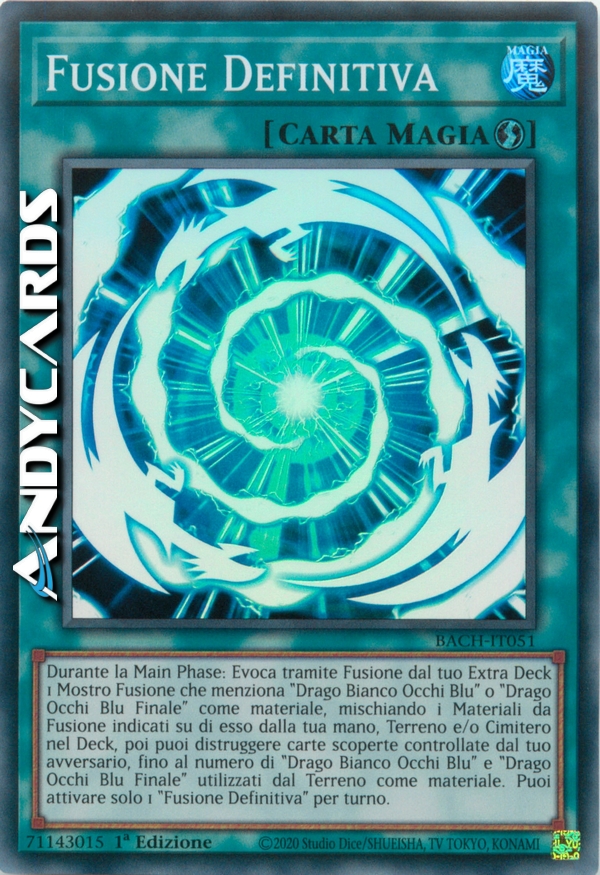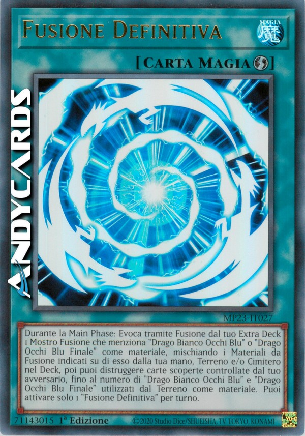Durante la Main Phase: Evoca tramite Fusione dal tuo Extra Deck 1 Mostro Fusione che menziona "Drago Bianco Occhi Blu" o "Drago Occhi Blu Finale" come materiale, mischiando i Materiali da Fusione indicati su di esso dalla tua mano, Terreno e/o Cimitero nel Deck, poi puoi distruggere carte scoperte controllate dal tuo avversario, fino al numero di "Drago Bianco Occhi Blu" e "Drago Occhi Blu Finale" utilizzati dal Terreno come materiale. Puoi attivare solo 1 "Fusione Definitiva" per turno.