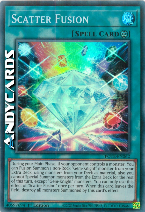 During your Main Phase, if your opponent controls a monster: You can Fusion Summon 1 non-Rock "Gem-Knight" monster from your Extra Deck, using monsters from your Deck as material, also you cannot Special Summon monsters from the Extra Deck for the rest of this turn, except "Gem-Knight" monsters. You can only use this effect of "Scatter Fusion" once per turn. When this card leaves the field, destroy all monsters Summoned by this card's effect.