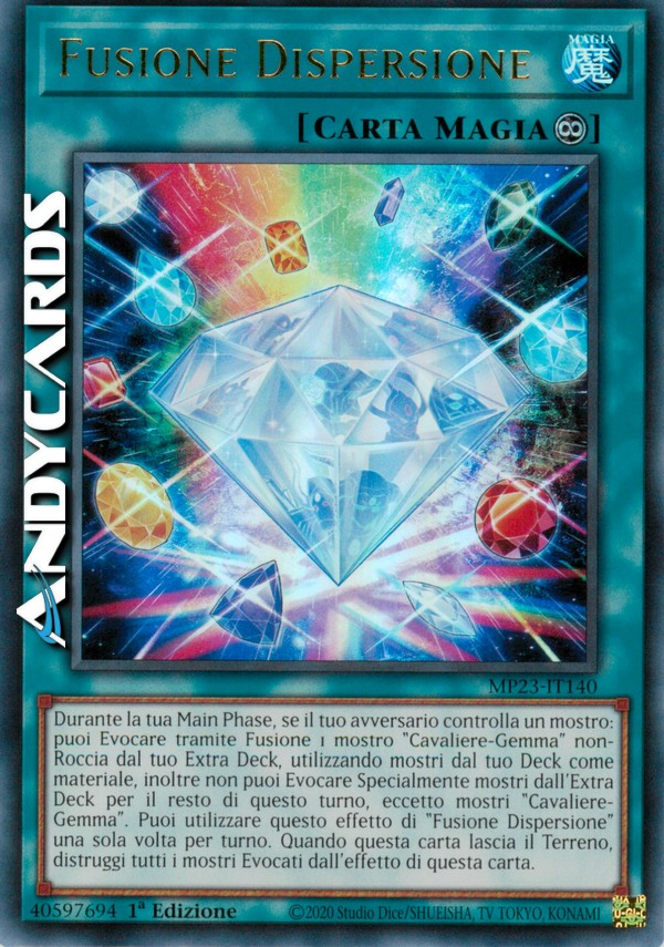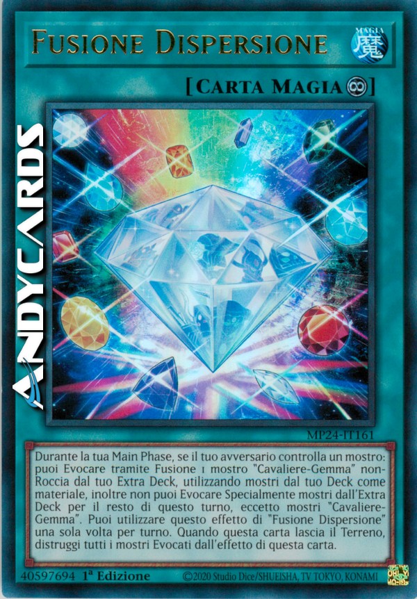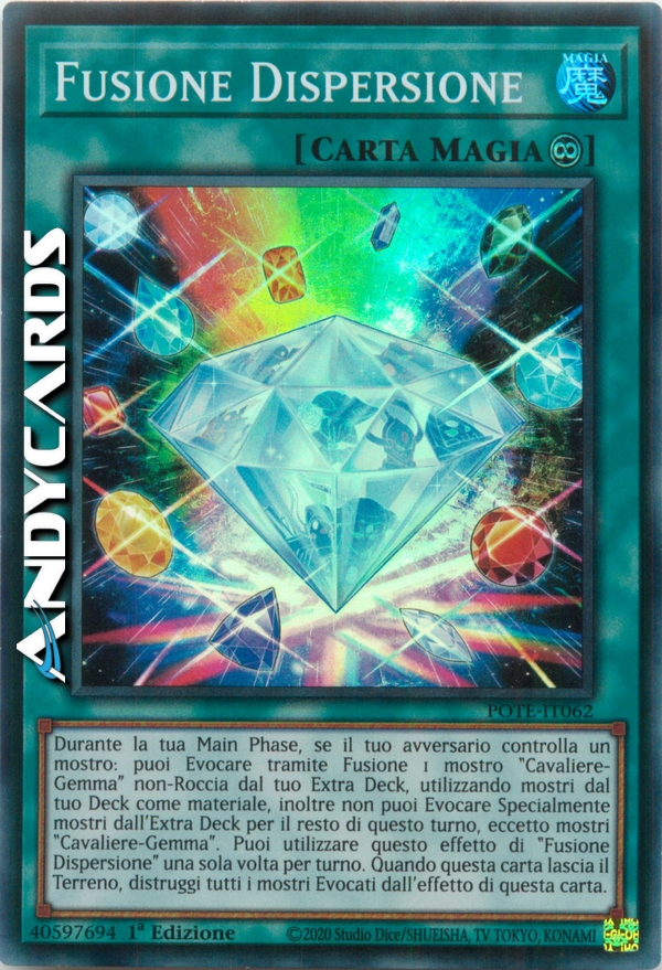 Durante la tua Main Phase, se il tuo avversario controlla un mostro: puoi Evocare tramite Fusione 1 mostro "Cavaliere-Gemma" non-Roccia dal tuo Extra Deck, utilizzando mostri dal tuo Deck come materiale, inoltre non puoi Evocare Specialmente mostri dall'Extra Deck per il resto di questo turno, eccetto mostri "Cavaliere-Gemma". Puoi utilizzare questo effetto di "Fusione Dispersione" una sola volta per turno. Quando questa carta lascia il Terreno, distruggi tutti i mostri Evocati dall'effetto di questa carta.