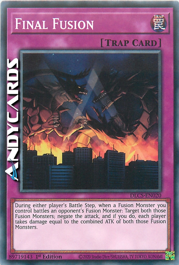 During either player's Battle Step, when a Fusion Monster you controlbattles an opponent's Fusion Monster: Target both those Fusion Monsters; negate the attack, and if you do, each player takes damageequal to the combined ATK of both those Fusion Monsters.