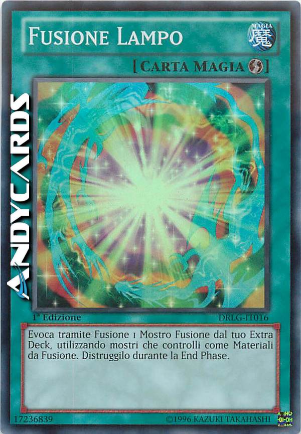 Evoca tramite Fusione 1 Mostro Fusione dal tuo Extra Deck, utilizzando mostri che controlli come Materiale da Fusione. Distruggilo durante la End Phase.