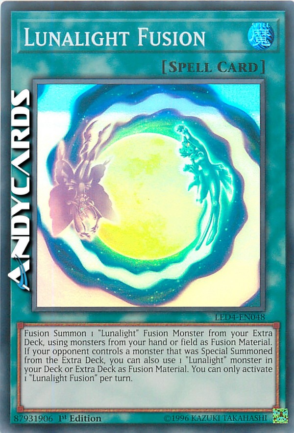 Evoca tramite Fusione 1 Mostro Fusione "Lucelunare" dal tuo Extra Deck, utilizzando mostri dalla tua mano o Terreno come Materiale da Fusione. Se il tuo avversario controlla un mostro che è stato Evocato Specialmente dall'Extra Deck, puoi anche utilizzare 1 mostro "Lucelunare" nel tuo Deck o Extra Deck come Materiale da Fusione. Puoi attivare solo 1 "Fusione Lucelunare" per turno.