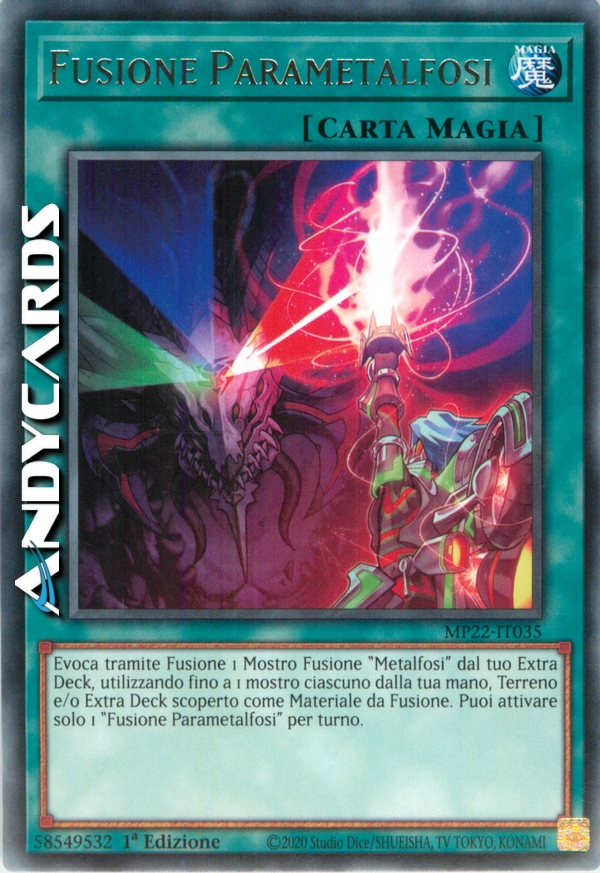 Evoca tramite Fusione 1 Mostro Fusione "Metalfosi" dal tuo Extra Deck, utilizzando fino a 1 mostro ciascuno dalla tua mano, Terreno e/o Extra Deck scoperto come Materiale da Fusione. Puoi attivare solo 1 "Fusione Parametalfosi" per turno.