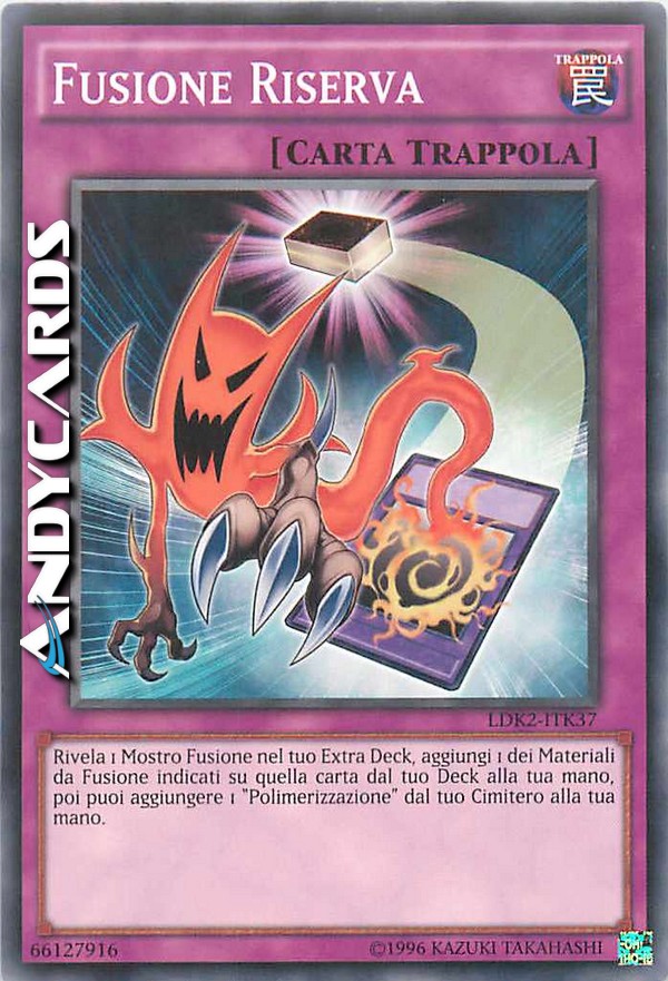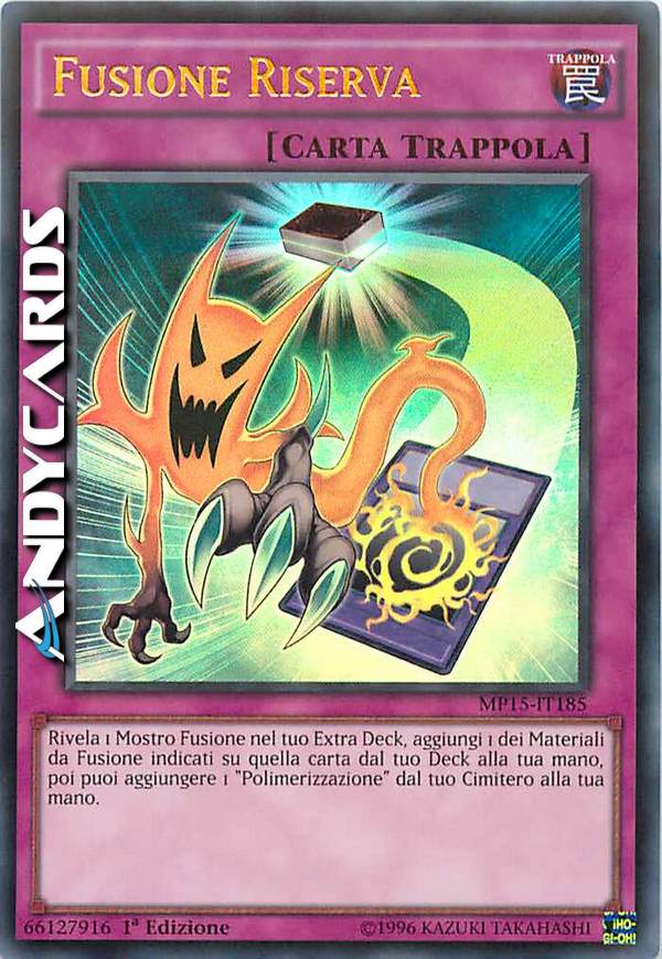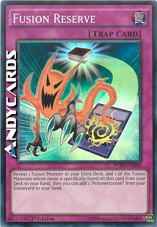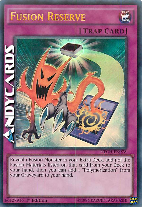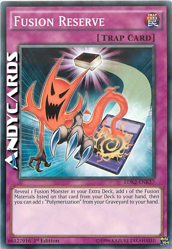 Rivela 1 Mostro Fusione nel tuo Extra Deck, aggiungi 1 dei Materiali da Fusione il cui nome è specificamente indicato su quella carta dal tuo Deck alla tua mano, poi puoi aggiungere 1 "Polimerizzazione" dal tuo Cimitero alla tua mano.