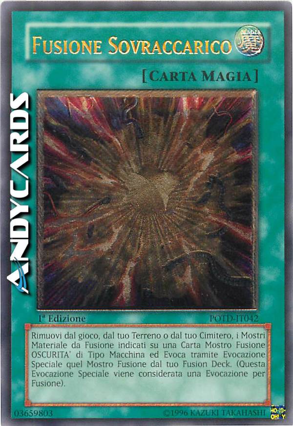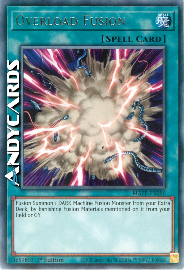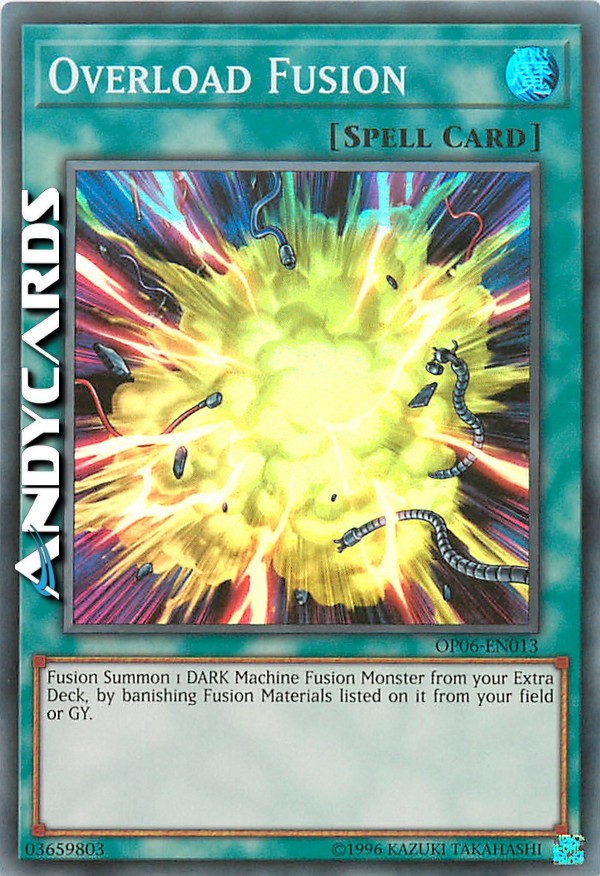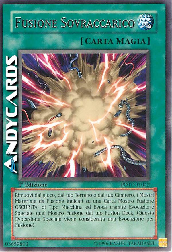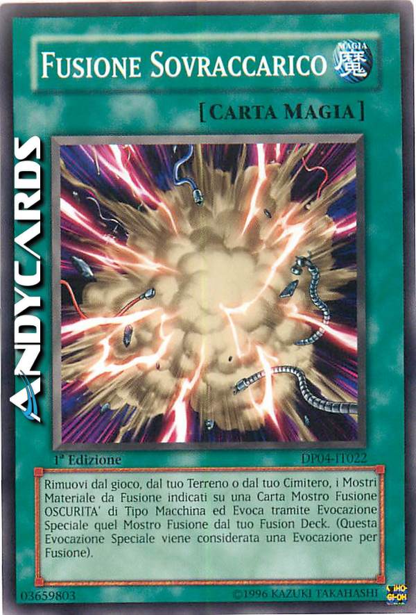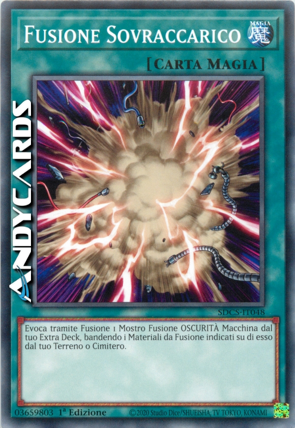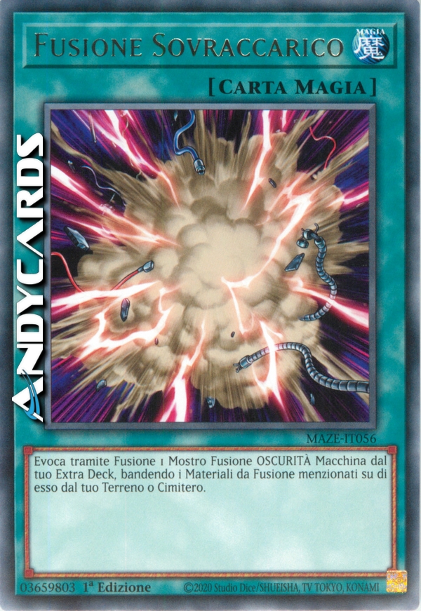 Bandisci, dal tuo Terreno o dal tuo Cimitero, i Mostri Materiale da Fusione indicati su una Carta Mostro Fusione OSCURITÀ di Tipo Macchina, poi Evoca Specialmente quel Mostro Fusione dal tuo Extra Deck. (Questa Evocazione Speciale è considerata un'Evocazione tramite Fusione.)