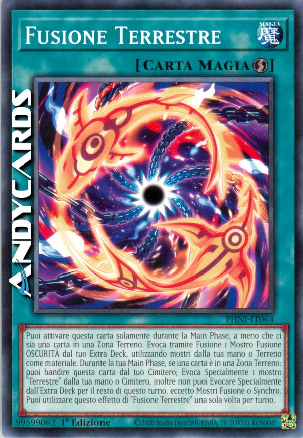 Puoi attivare questa carta solamente durante la Main Phase, a meno che ci sia una carta in una Zona Terreno. Evoca tramite Fusione 1 Mostro Fusione OSCURITÀ dal tuo Extra Deck, utilizzando mostri dalla tua mano o Terreno come materiale. Durante la tua Main Phase, se una carta è in una Zona Terreno: puoi bandire questa carta dal tuo Cimitero; Evoca Specialmente 1 mostro "Terrestre" dalla tua mano o Cimitero, inoltre non puoi Evocare Specialmente dall'Extra Deck per il resto di questo turno, eccetto Mostri Fusione o Synchro. Puoi utilizzare questo effetto di "Fusione Terrestre" una sola volta per turno.