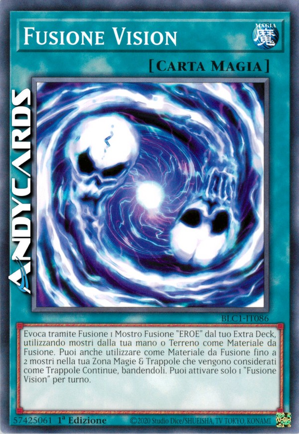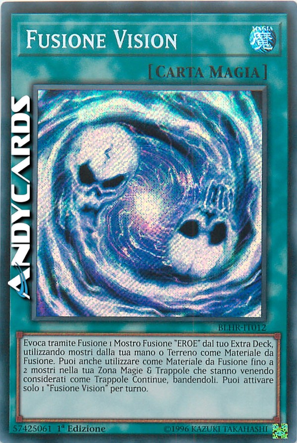 Evoca tramite Fusione 1 Mostro Fusione "EROE" dal tuo Extra Deck, utilizzando mostri dalla tua mano o Terreno come Materiale da Fusione. Puoi anche utilizzare come Materiale da Fusione fino a 2 mostri nella tua Zona Magie & Trappole che stanno venendo considerati come Trappole Continue, bandendoli. Puoi attivare solo 1 "Fusione Vision" per turno.