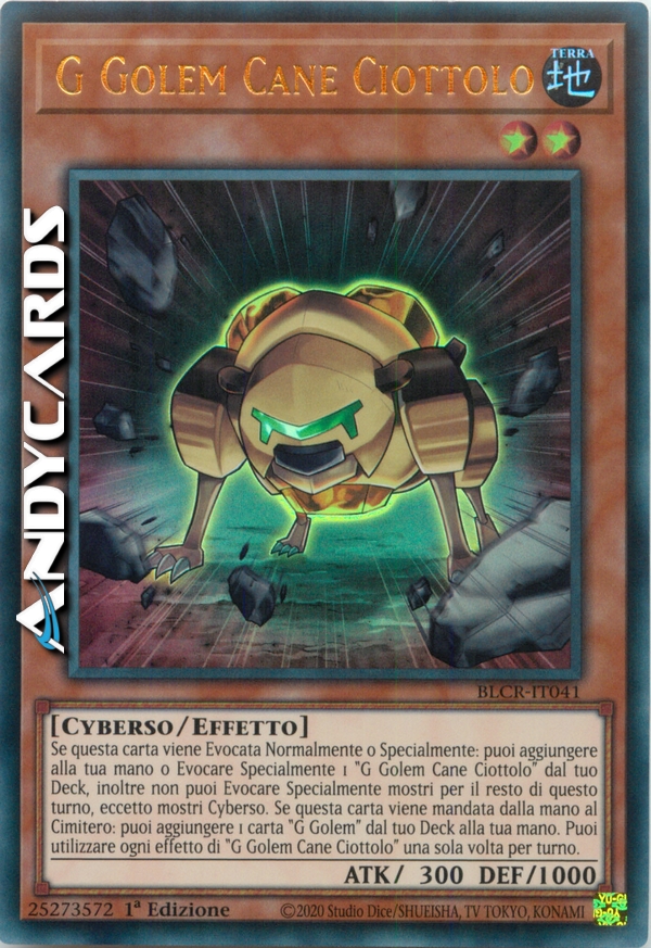 Se questa carta viene Evocata Normalmente o Specialmente: puoi aggiungere alla tua mano o Evocare Specialmente 1 "G Golem Cane Ciottolo" dal tuo Deck, inoltre non puoi Evocare Specialmente mostri per il resto di questo turno, eccetto mostri Cyberso. Se questa carta viene mandata dalla mano al Cimitero: puoi aggiungere 1 carta "G Golem" dal tuo Deck alla tua mano. Puoi utilizzare ogni effetto di "G Golem Cane Ciottolo" una sola volta per turno.
