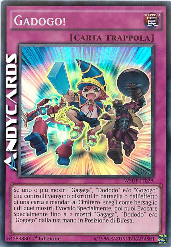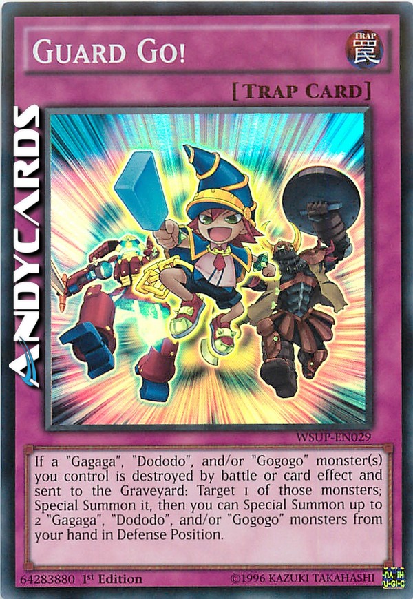 Se uno o più mostri "Gagaga", "Dododo" e/o "Gogogo" che controlli vengono distrutti in battaglia o dall'effetto di una carta e mandati al Cimitero: scegli come bersaglio 1 di quei mostri; Evocalo Specialmente, poi puoi Evocare Specialmente fino a 2 mostri "Gagaga", "Dododo" e/o "Gogogo" dalla tua mano in Posizione di Difesa.